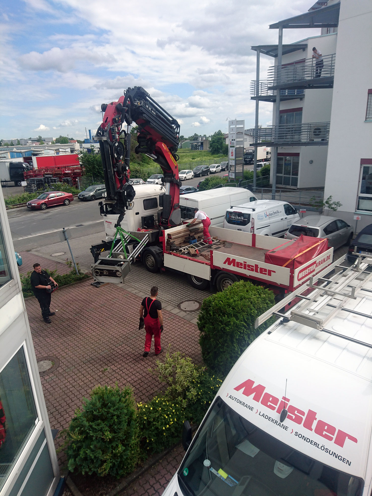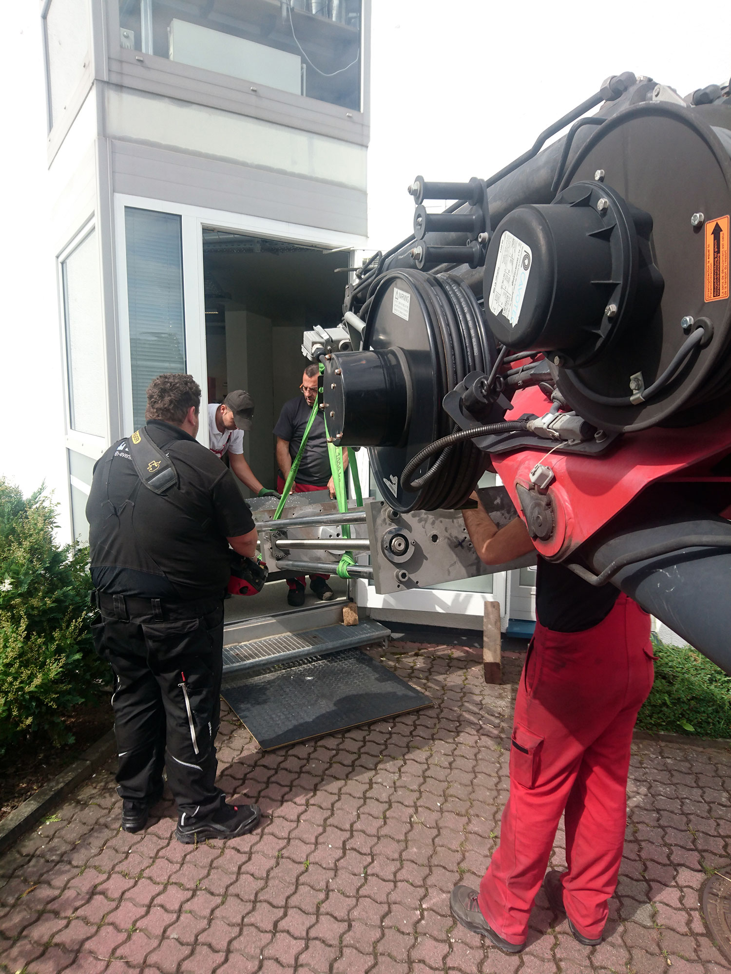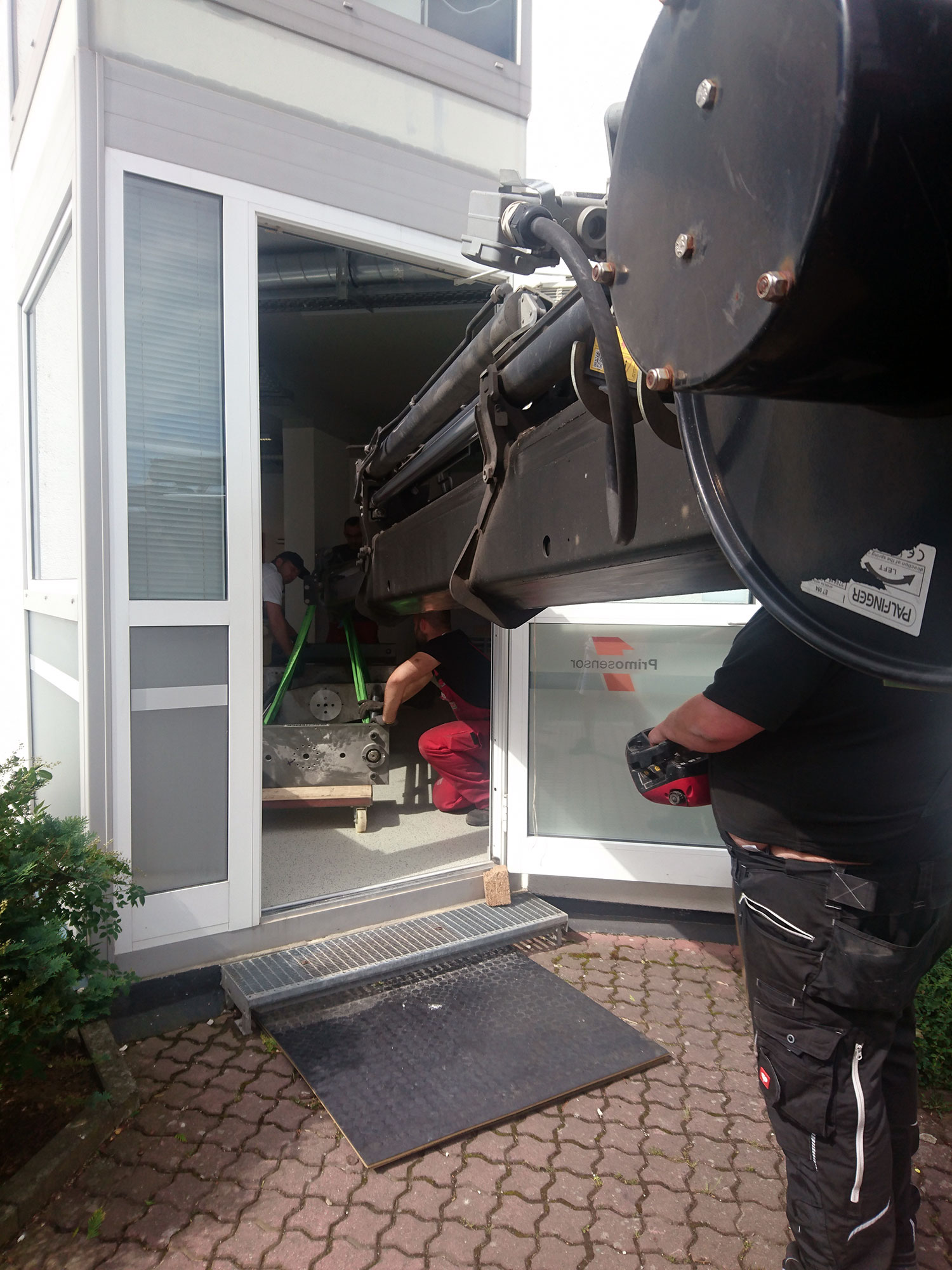 Die Erweiterung der Produktion im Stammhaus in Dieburg. Als im vergangenen Jahr Räumlichkeiten im Erdgeschoss des genutzten Gebäudes frei wurden, griff man zu und baute in den vergangenen Monaten die Räume um und aus. Am 18. Juni kam dann das Team mit dem Kran, um den einige Tonnen schweren Prüfstand für Kraftaufnehmer und Messringe zu zerlegen und die noch immer mehrere hundert Kilo wiegenden, einzelnen Bauteile aus dem ersten Stock in die neuen Räume im Erdgeschoss zu transportieren. Ein großer Dank geht dafür von uns an das Team der Firma Meister in Dieburg, die das mit eben der Präzision erledigte, die wir für unsere Produkte als Maßstab nehmen.