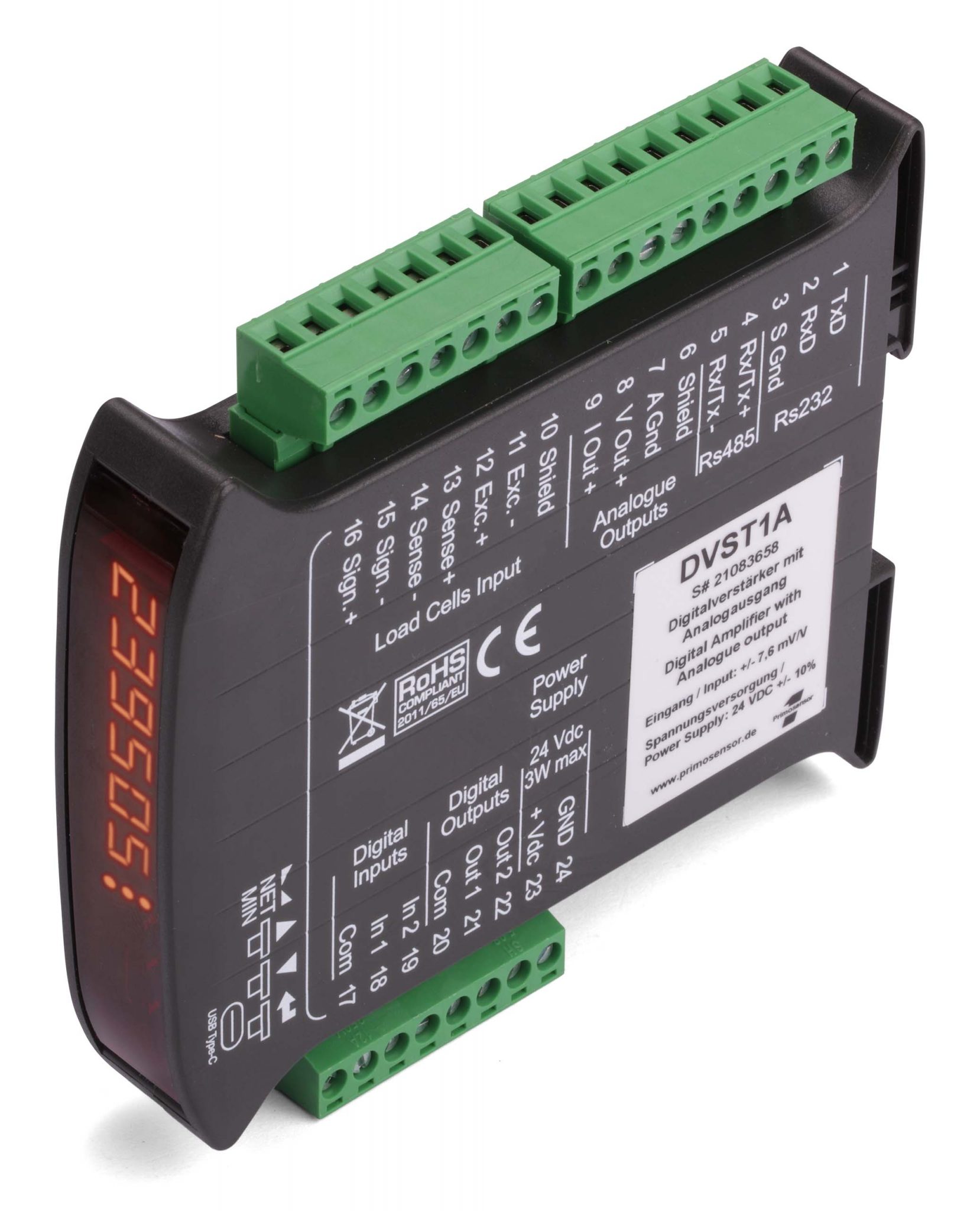 Digitaler DMS-Messverstärker mit Analogausgang für Hutschienenmontageund Anschluss an Primosensor Kraftaufnehmer und Wägezellen mit mV/V-Ausgangssignal (DMS). Der 4…20 mA Analogausgang, die RS-232-Schnittstelle sowie die zwei potentialfreien Grenzwertrelaiskontakte ermöglichen die Realisierung einer Vielzahl von Überwachungsaufgaben bei der Last- und Kraftmessung.